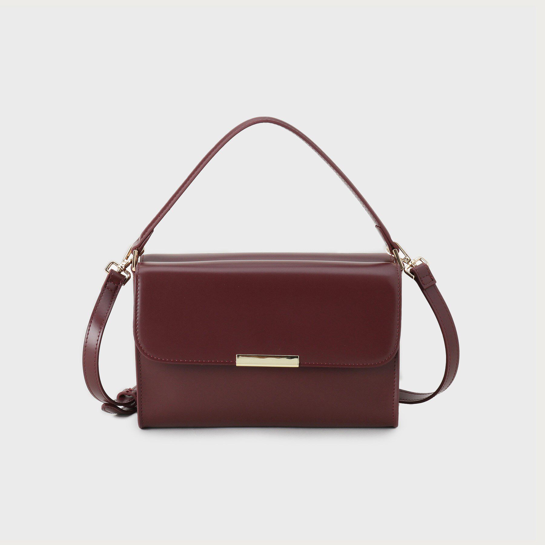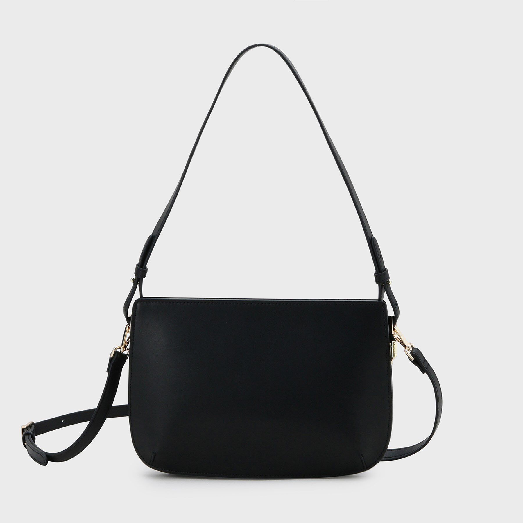 【デザイン】モダンなデザインでスタイリングを格上げする、ワンハンドルのショルダーバッグ。ツヤのある合成皮革を使用し、エレガントな印象を与えます。前後.. |