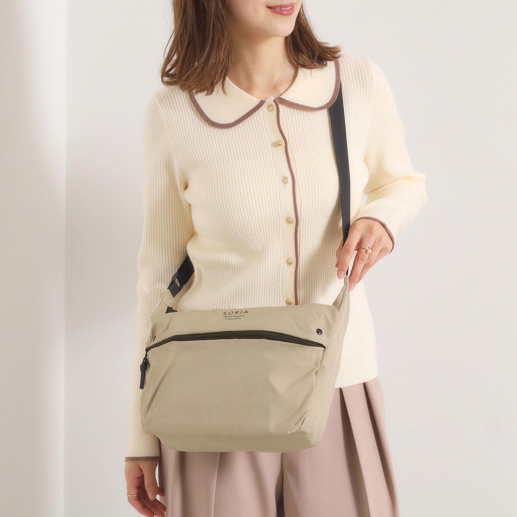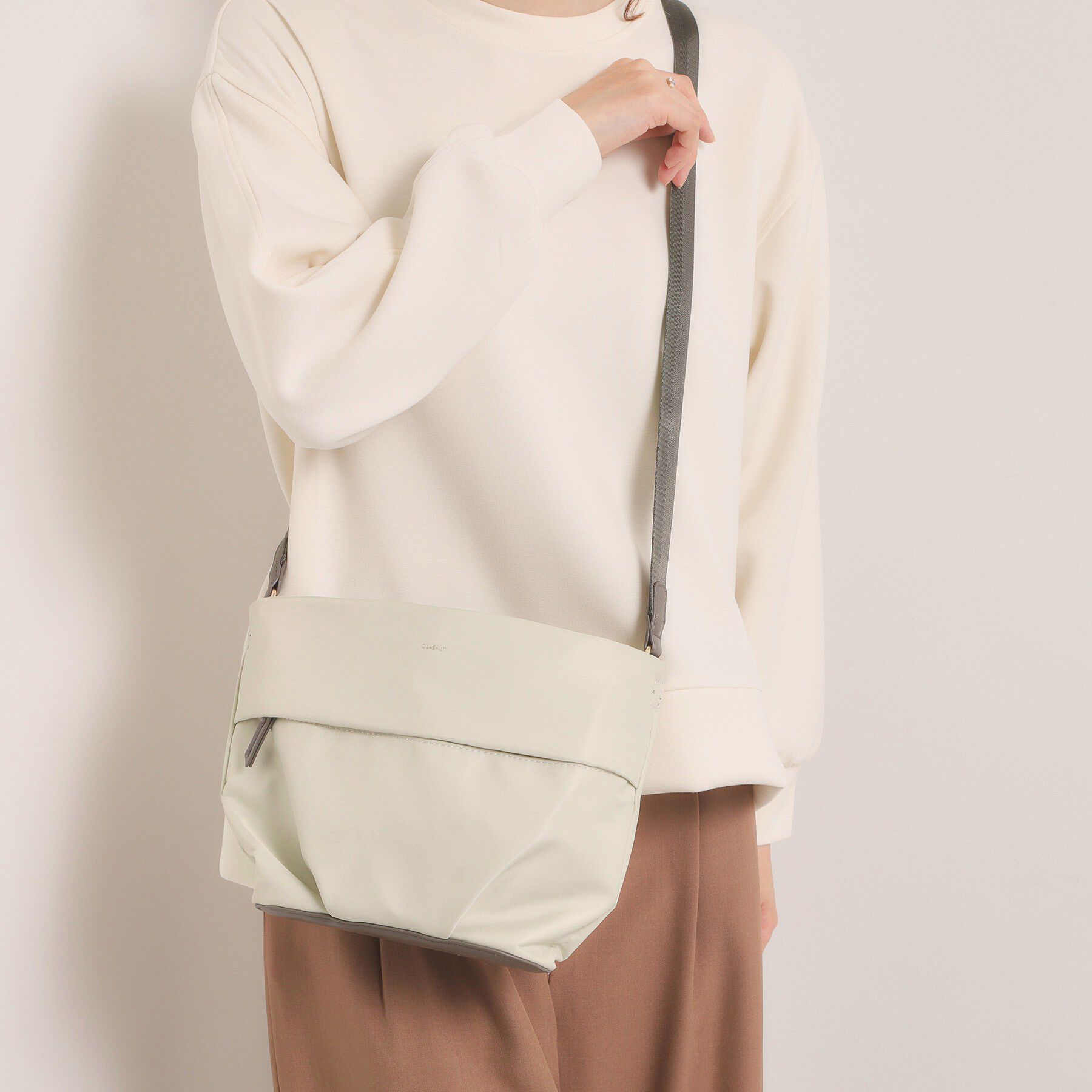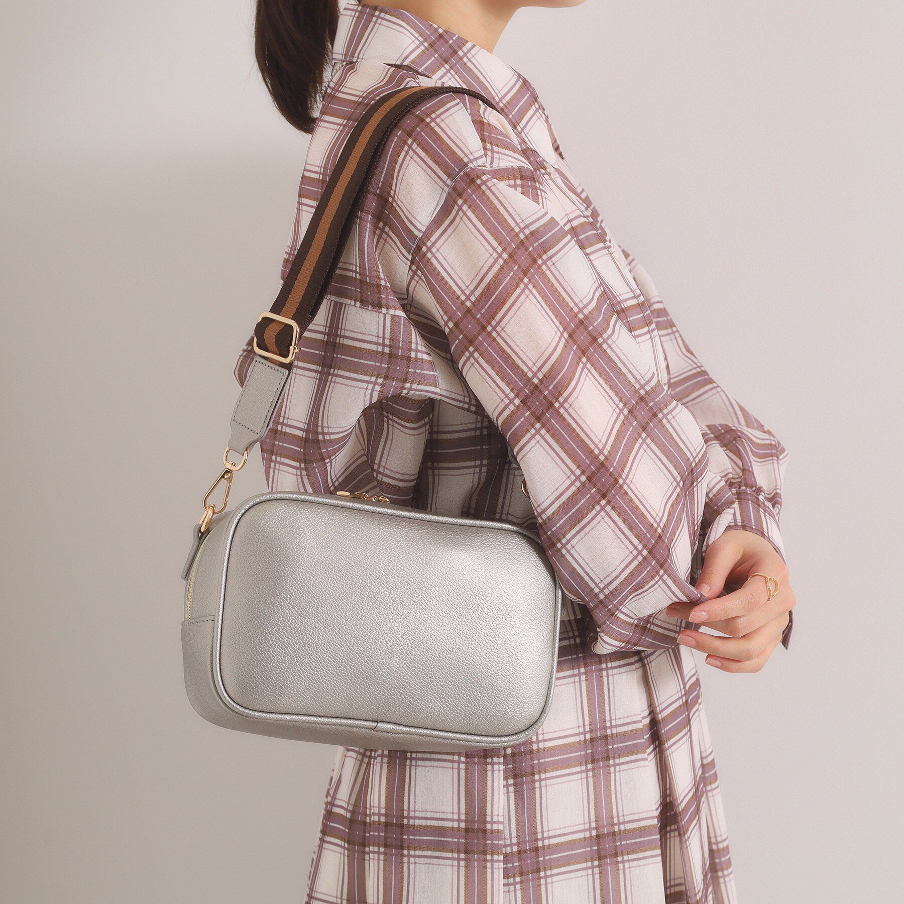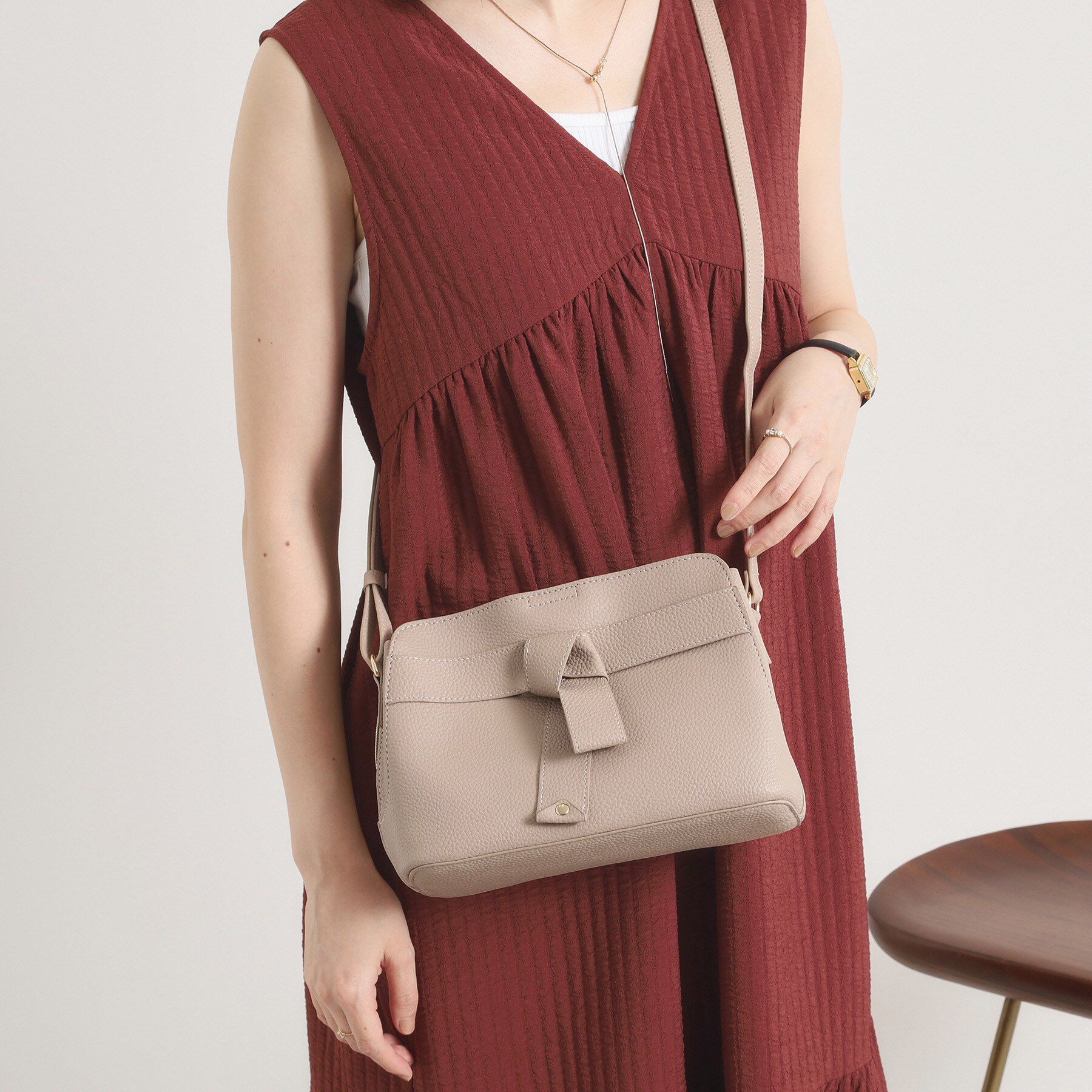 【デザイン】身軽に出かけたい日にちょうどいい。「楽もちバッグシリーズ」の横型ミニショルダー。シボ感のある素材で高見えしつつ軽やかな横型フォルムです。.. |