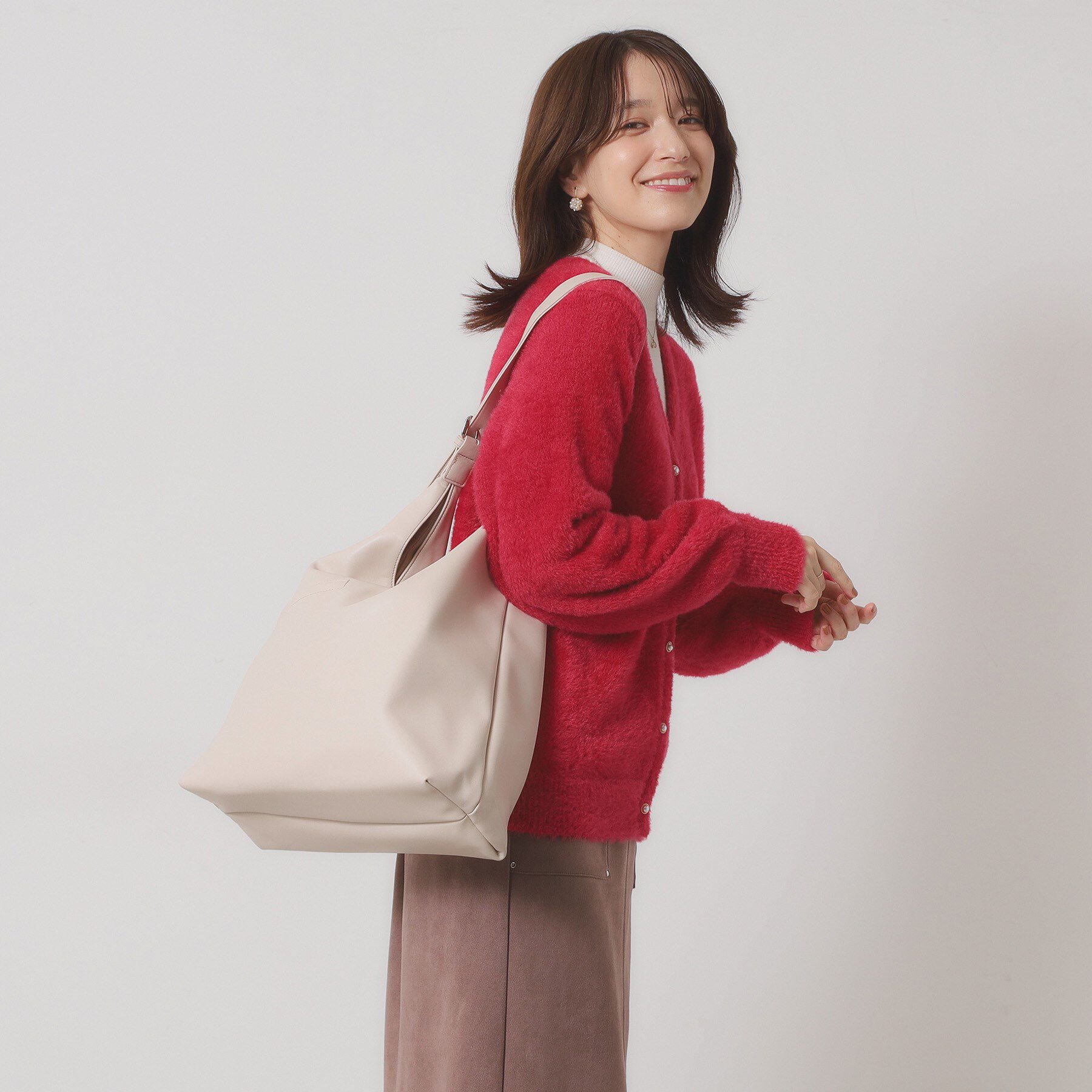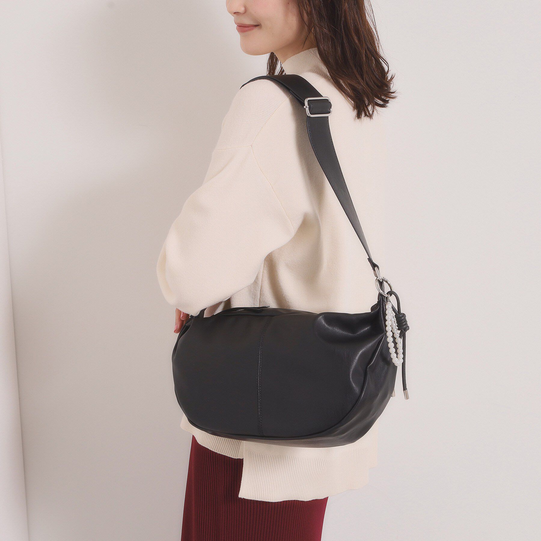 【デザイン】上品な光沢と丸みのあるフォルムが魅力のショルダーバッグ。さりげないパール調チャームが女性らしいアクセントになり、カジュアルからきれいめま.. |