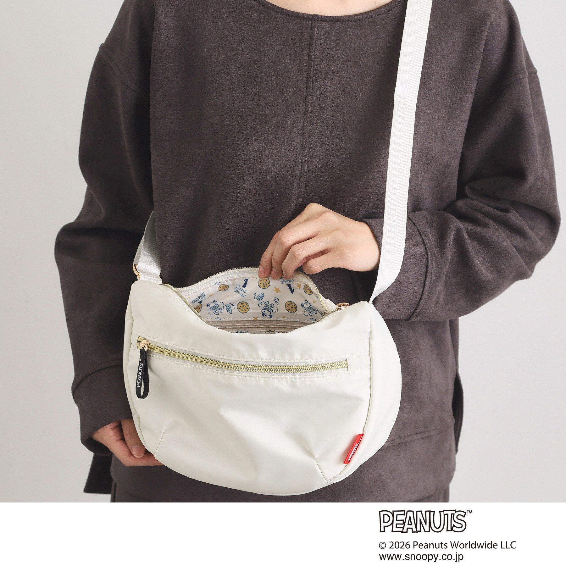 【デザイン】開けるたびに気分が上がる♪PEANUTSミニショルダー。シンプルで上品な丸みのあるフォルムに、さりげないゴールドの金具とPEANUTSのタグをあしらっ.. |