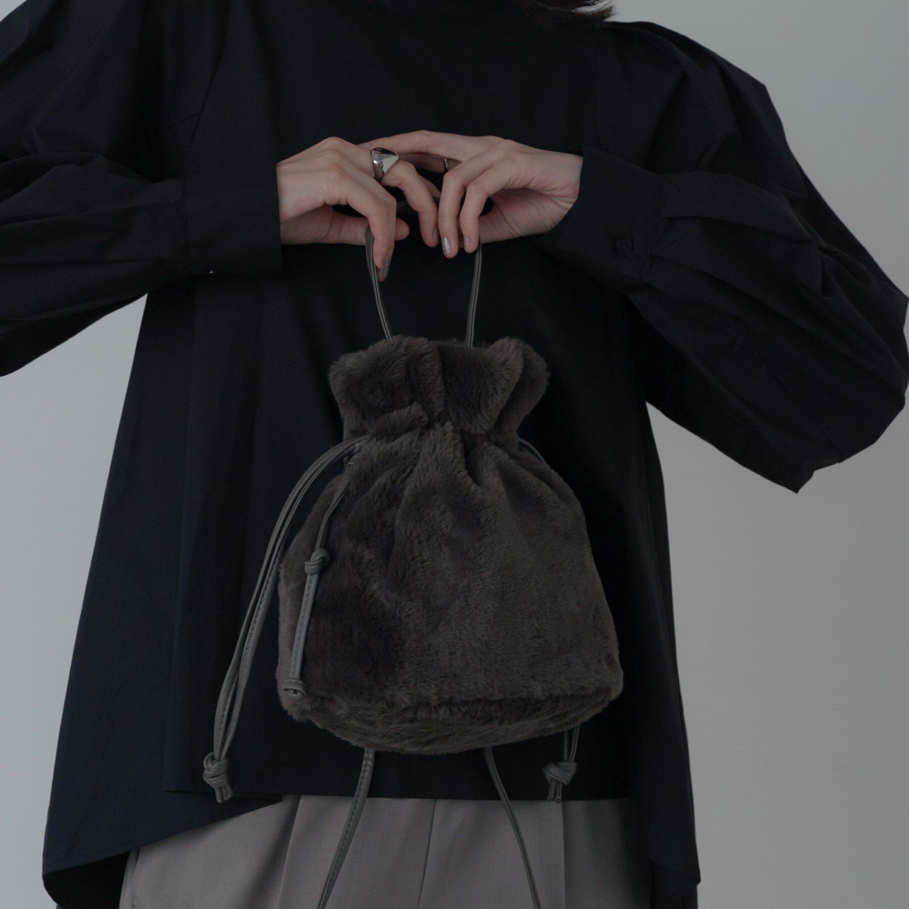 【デザイン】ヌバック調の素材を使用したエレガントなショルダーバッグ。巾着スタイルでキュッと絞ればコンパクトでかわいらしいフォルムに、絞らずにそのまま.. |