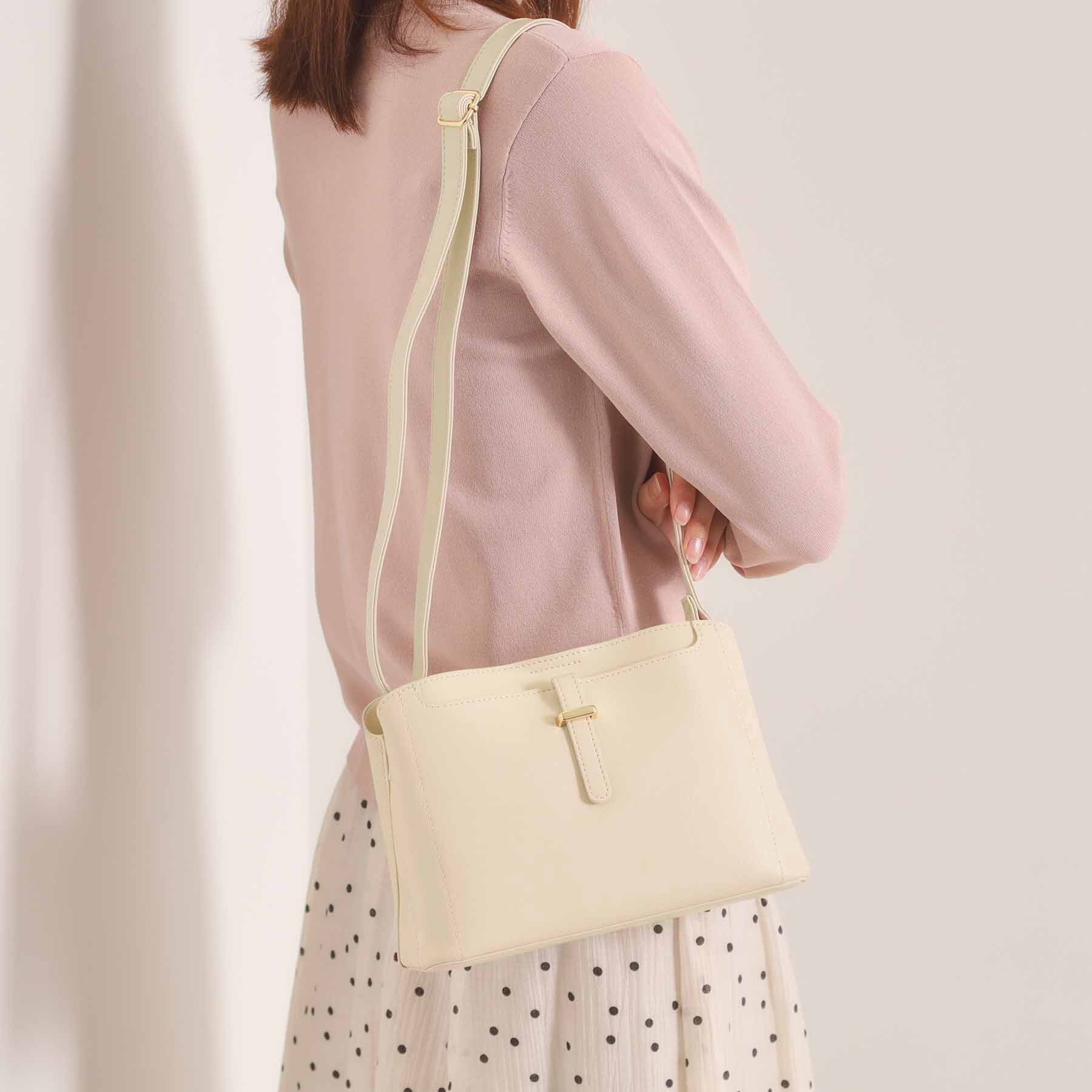 【デザイン】上品な光沢と丸みのあるフォルムが魅力のショルダーバッグ。さりげないパール調チャームが女性らしいアクセントになり、カジュアルからきれいめま.. |