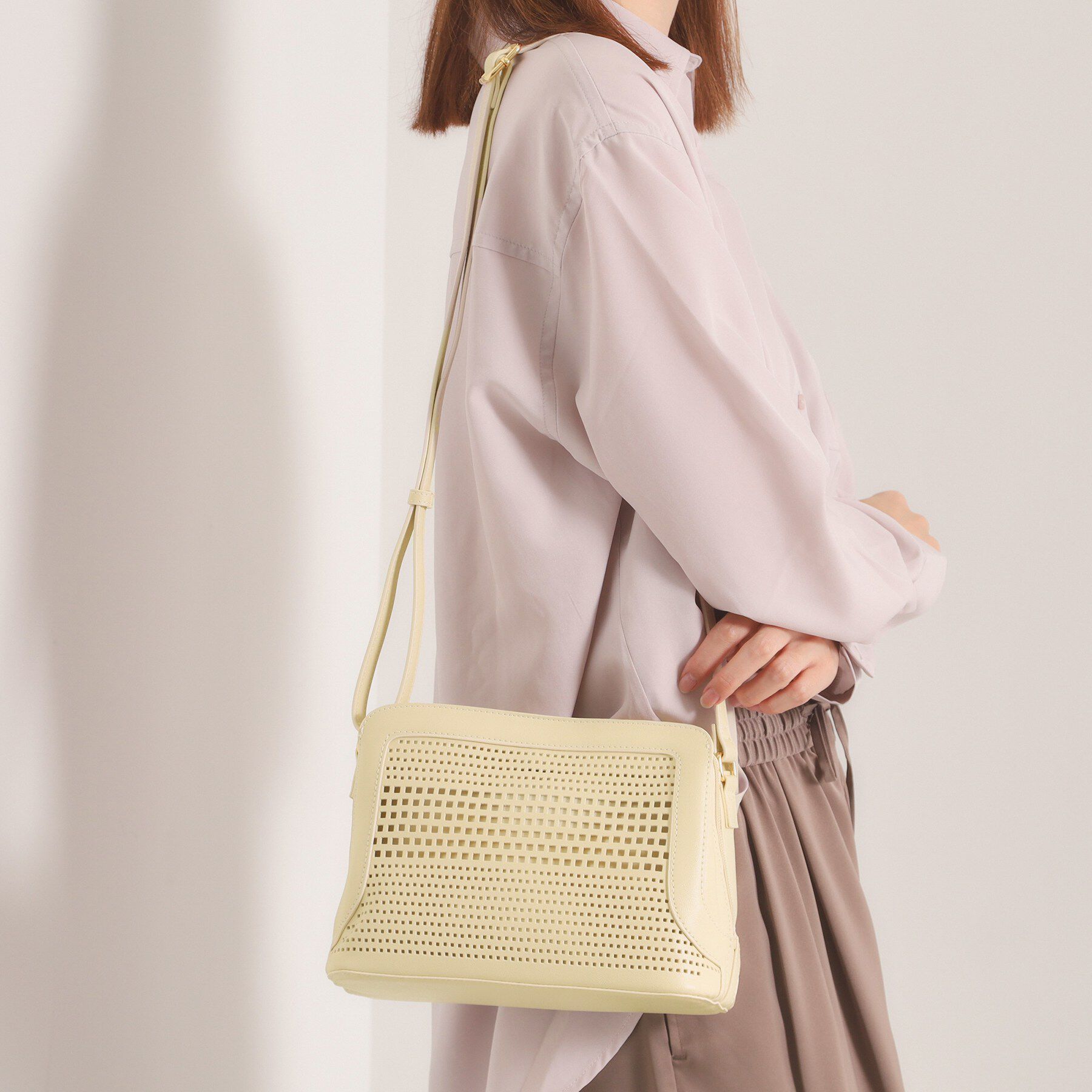 【デザイン】スクエアのパンチングパネルが目を引く、ほどよく抜け感のあるミニショルダー。柔らかな合成皮革にゴールド金具を合わせた上品な雰囲気で、カジュ.. |