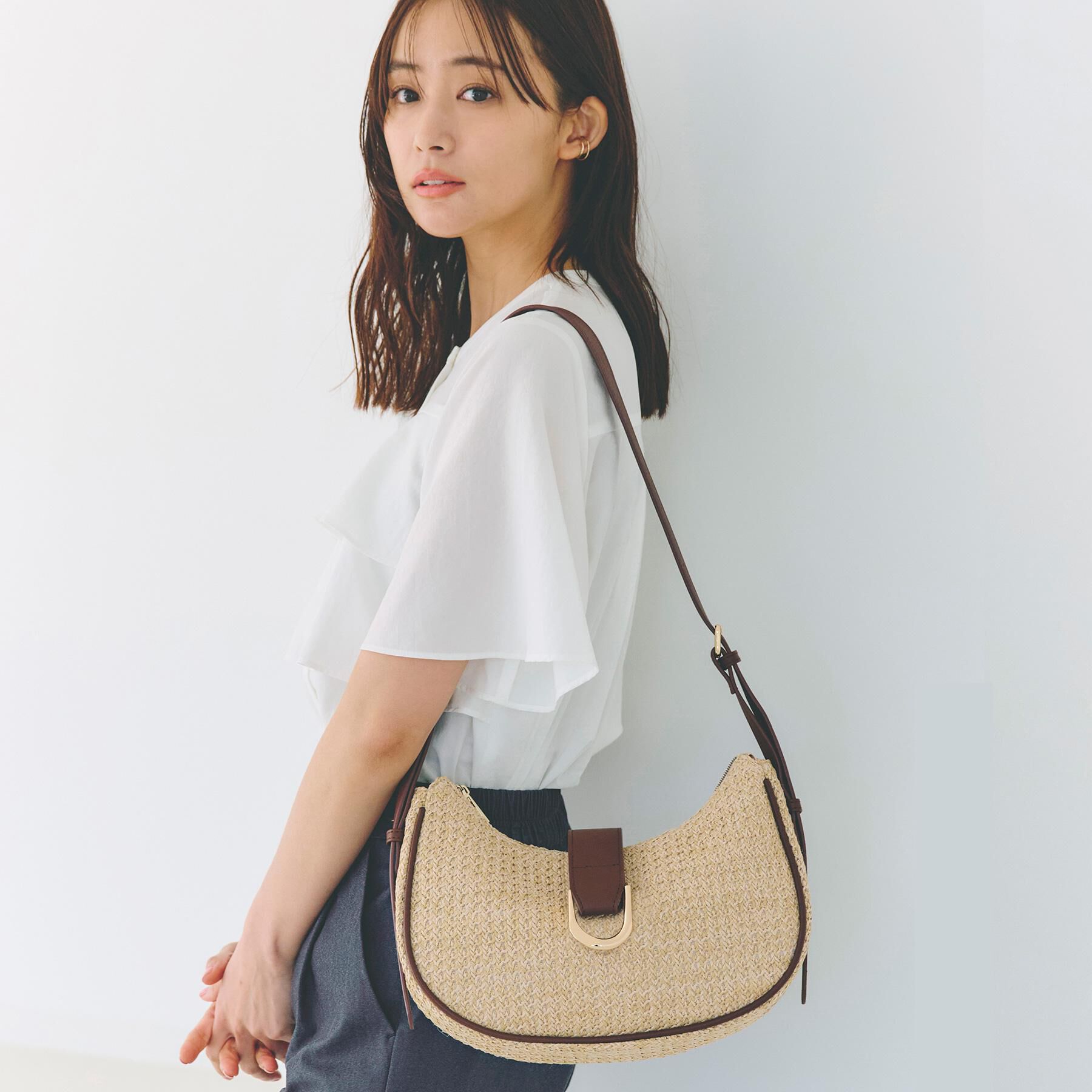 【デザイン】雑材素材と合成皮革のコンビのムーンショルダー。ショルダーの長さ調整でワンショルダーでも斜め掛けもできます。前ベルトの先は存在感のあるメタ.. |