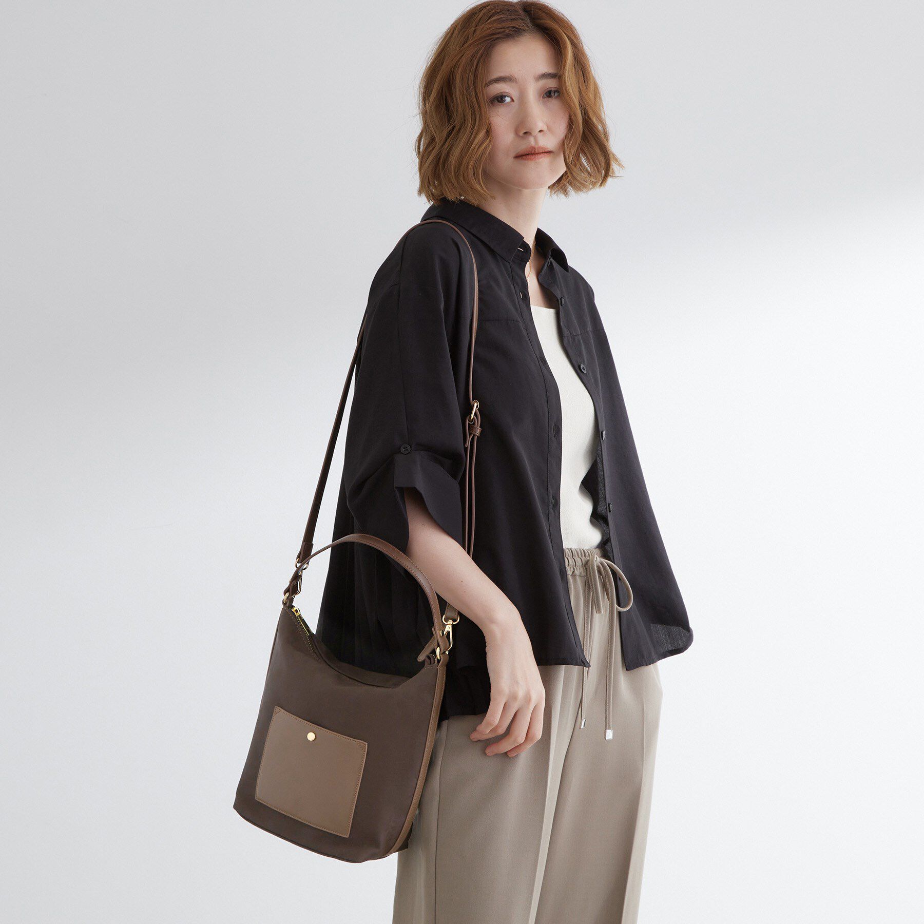 【華奢なショルダーが大人っぽい、アシンメトリーBAG】アシンメトリーの開口部が特徴的なショルダーBAG。華奢なショルダーが大人っぽいので、女性らしい小物合.. |