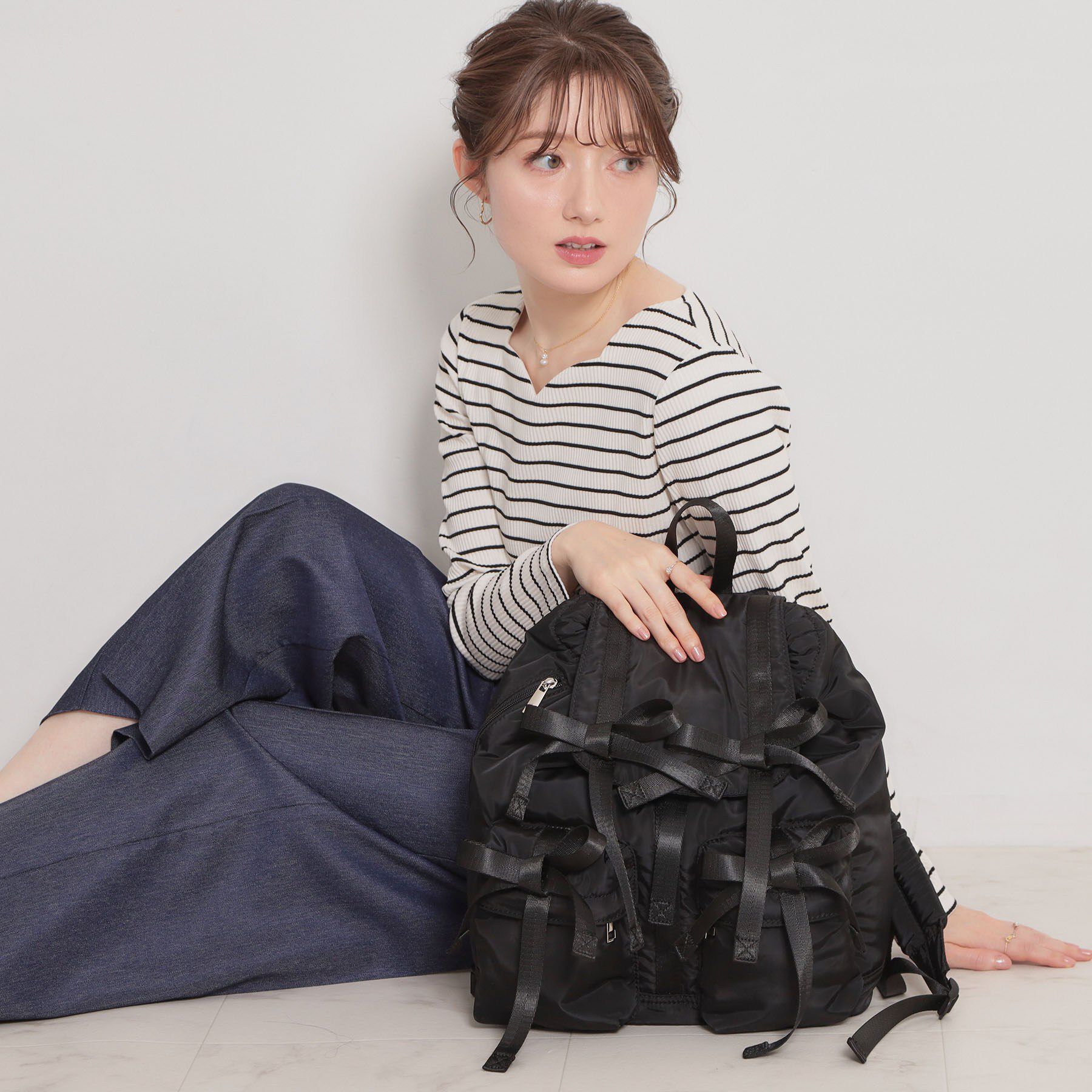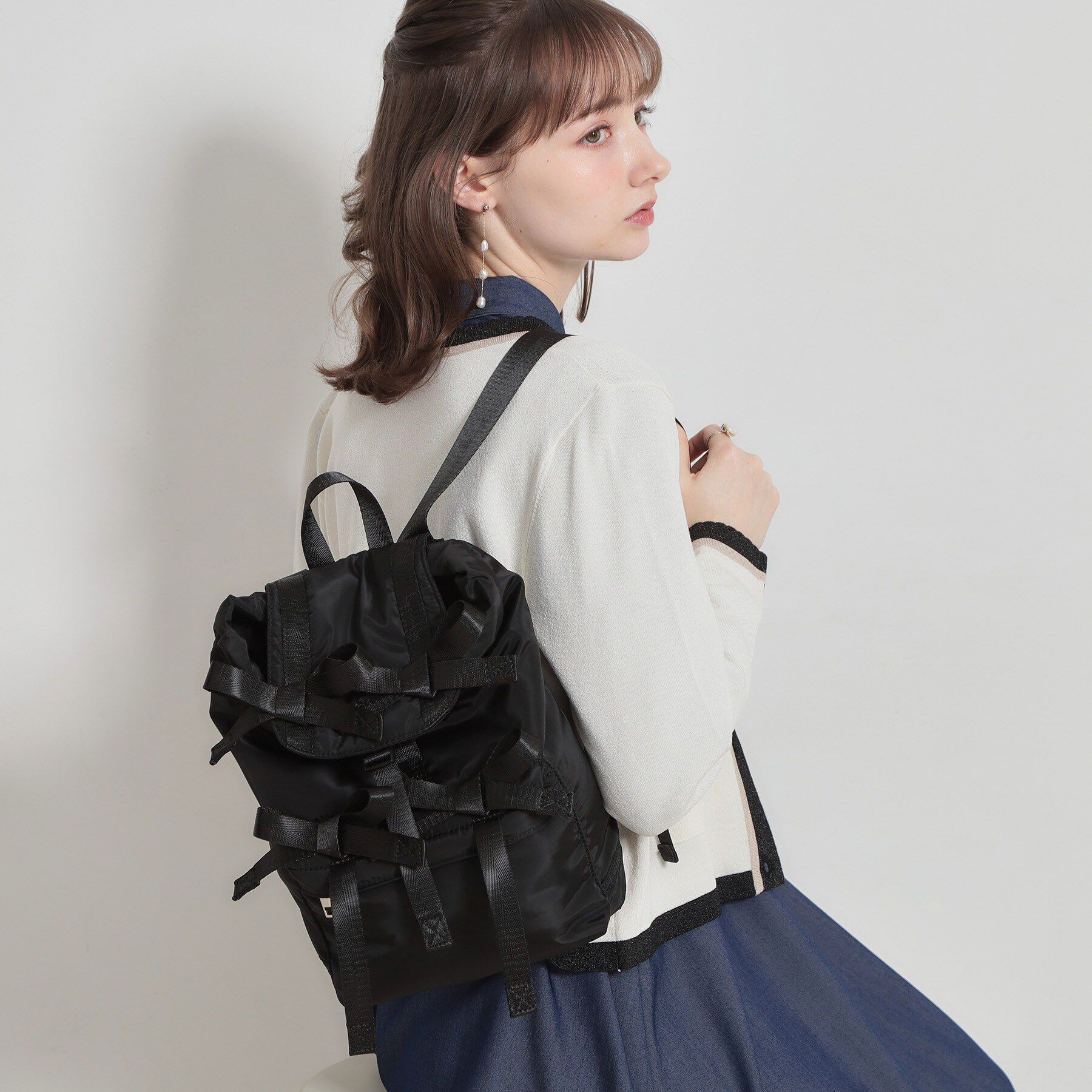 【デザイン】複数のリボンが存在感たっぷりのバックパック。外側に2つのポケット、サイド部分にはファスナーが付いており機能性はもちろんのこと、可愛らしい.. |