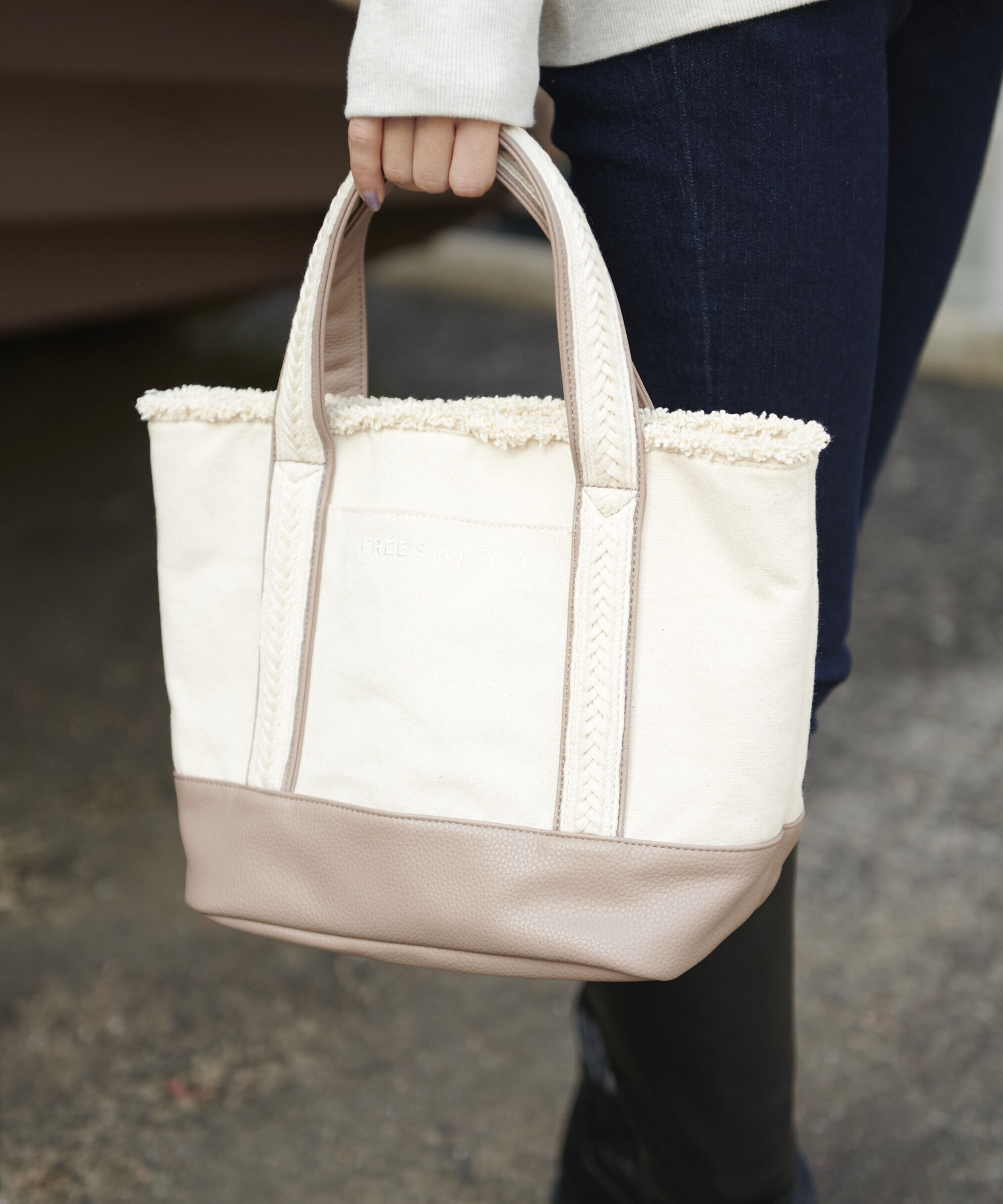 Free's Martで定番のフリンジトートバッグ。しっかりマチがあるデザインなので、必需品はもちろん少し多めに荷物が入れられます。切り替え部分には同色のフェ.. |