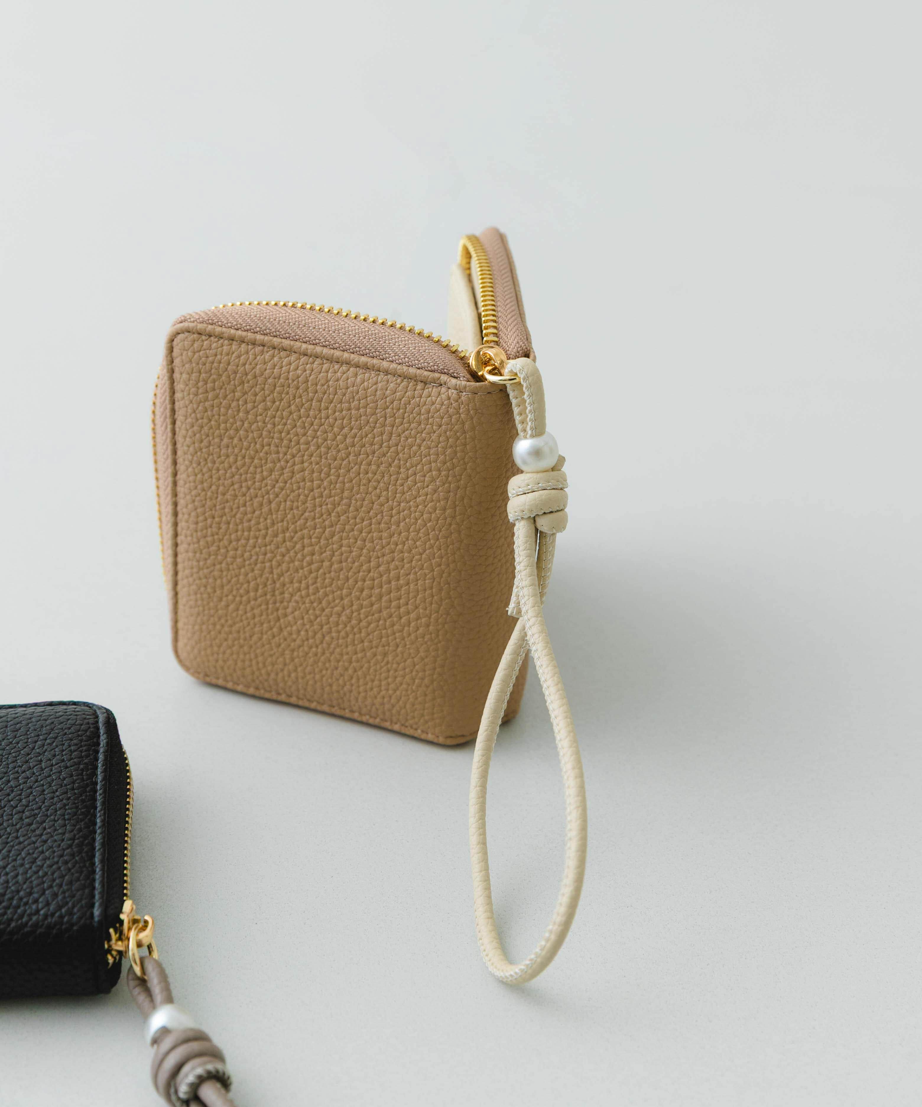 パールがアクセントのコンパクトウォレット【Design】ストラップ部分にパールをあしらい、大人かわいい印象に仕上げました。ストラップとウォレット本体はバイ.. |