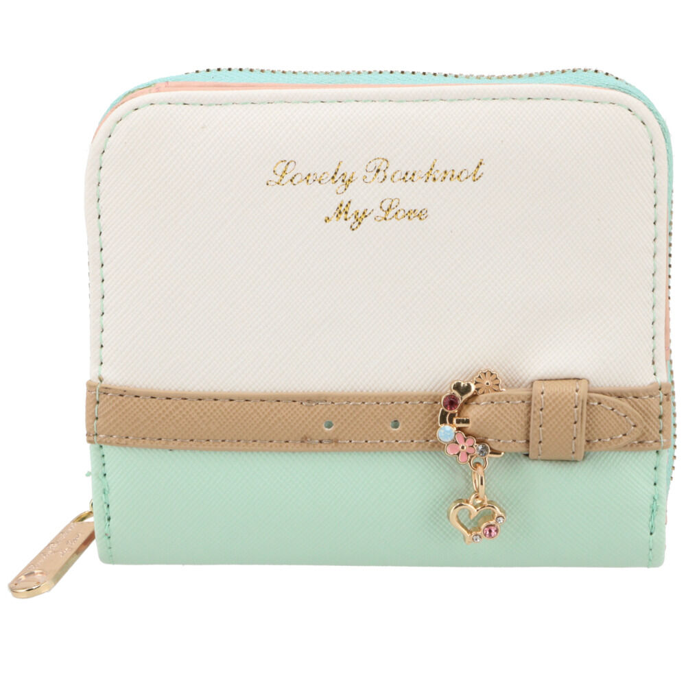 【商品説明】パステルカラーで女性らしい印象を演出してくれる♪二つ折り財布が登場!フロントのハート型チャームとベルトのようなデザインが、可愛らしさを引.. |