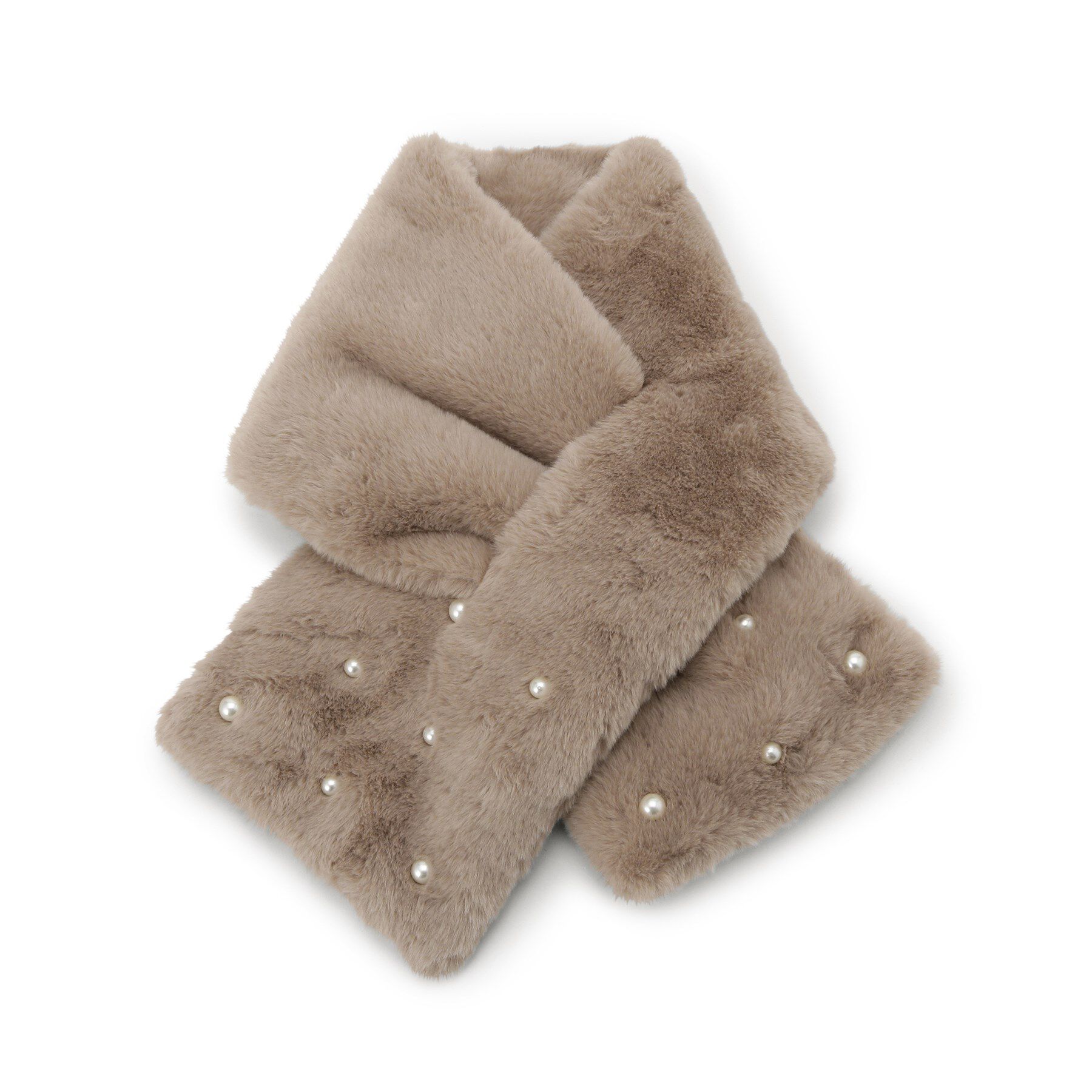 【デザイン】中綿入りで肉厚のフェイクファーティペット。差し込み口に大小異なるフェイクパールを連なったデザインで、アクセサリーがなくても顔回りを華やか.. |