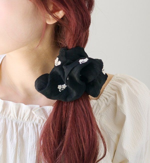 軽やかなシアー素材×フラワーステッチで、大人かわいいシュシュ ■デザイン 透け感のある軽やかな素材に、繊細なフラワーステッチを施したシュ.. |