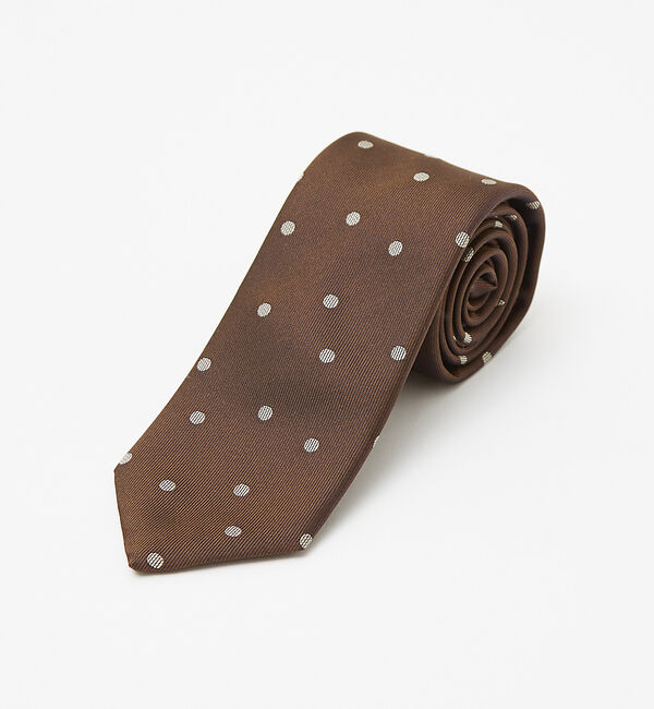 【素材】日本製のシルク100%の生地を使用。【デザイン】ブラウン×べージュのドット柄ネクタイ。キャッチーな印象のある柄でありながら、落ち着いた配色感で大.. |