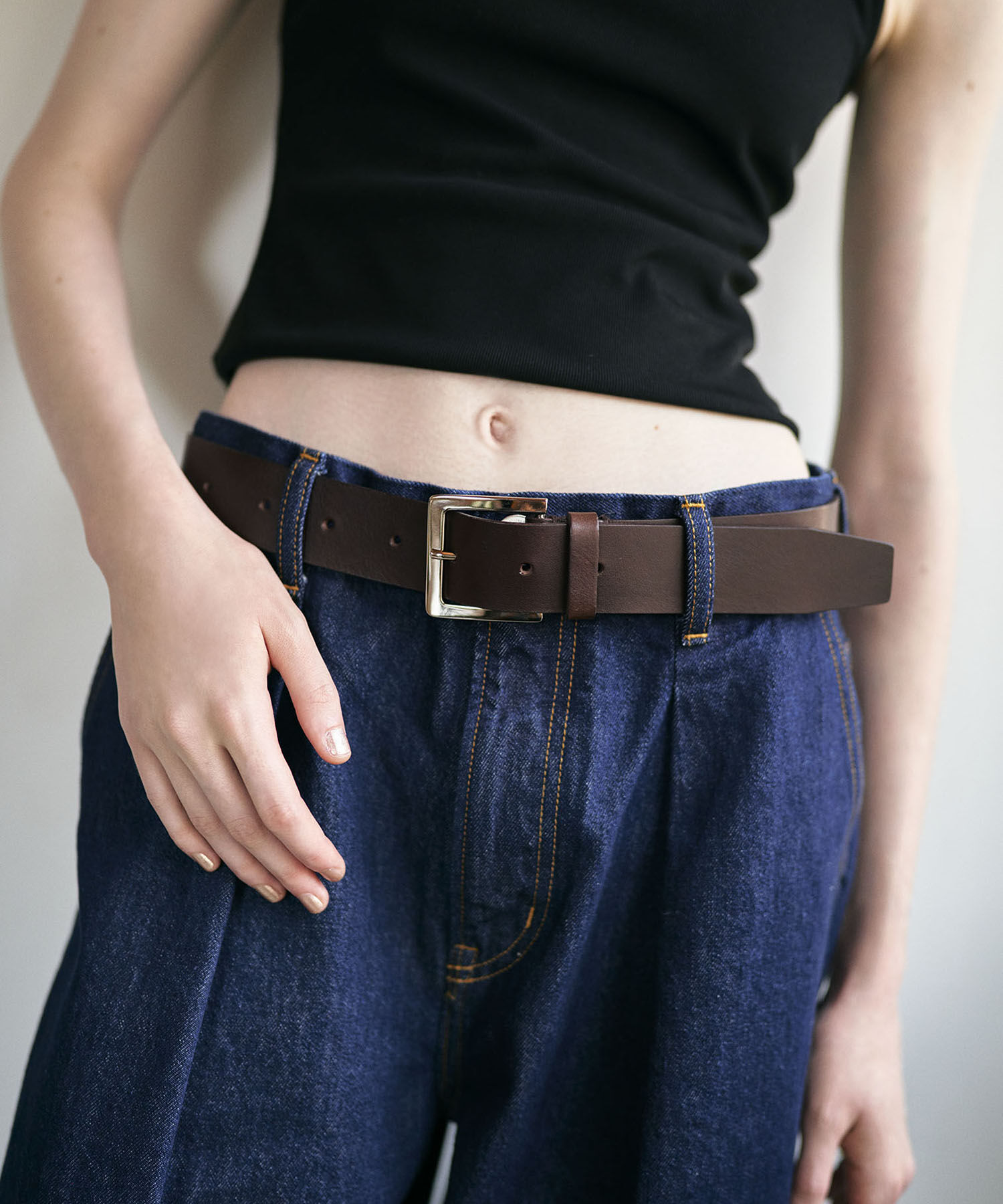 【潔いシンプルさで引き締める】●装飾を省いたミニマルなデザイン●シャープなスクエア型のシルバーバックル●存在感ある太めの幅がウエストをしっかりマーク一.. |