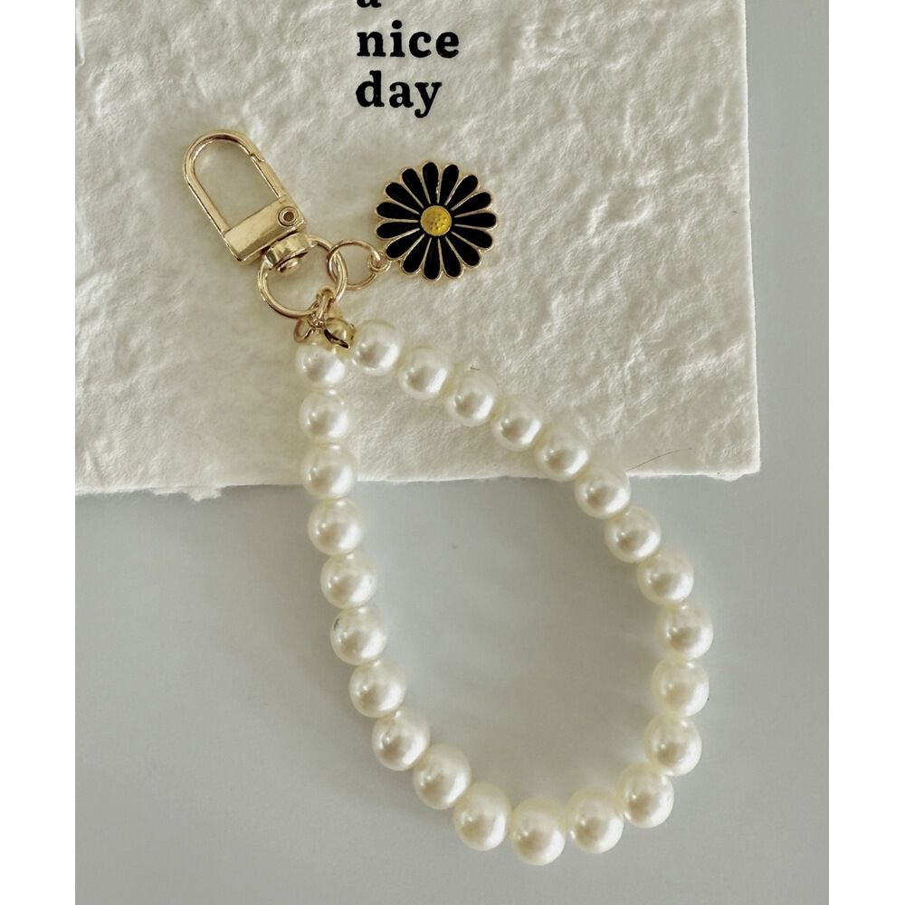 【商品説明】上品な艶めきを放つパールビーズに、ブラックのフラワーチャームがアクセントになったチャーム。ゴールド金具との組み合わせで華やかさをプラスし.. |