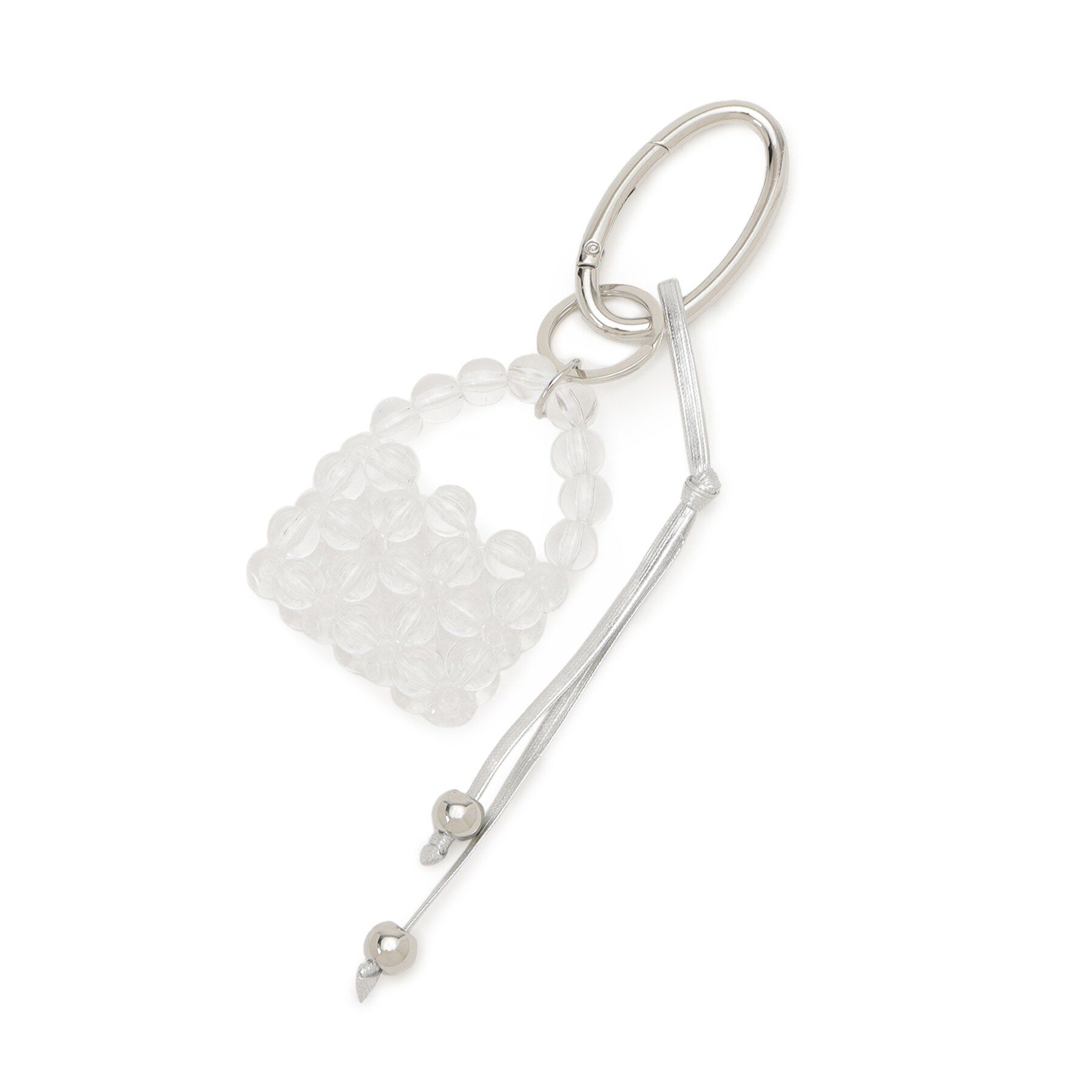 ビーズで手編みをしたミニバッグチャーム。【デザイン】フェイクパールとクリアビーズの2色で手編みされたミニバッグのバッグチャーム。フェイクパールはゴー.. |