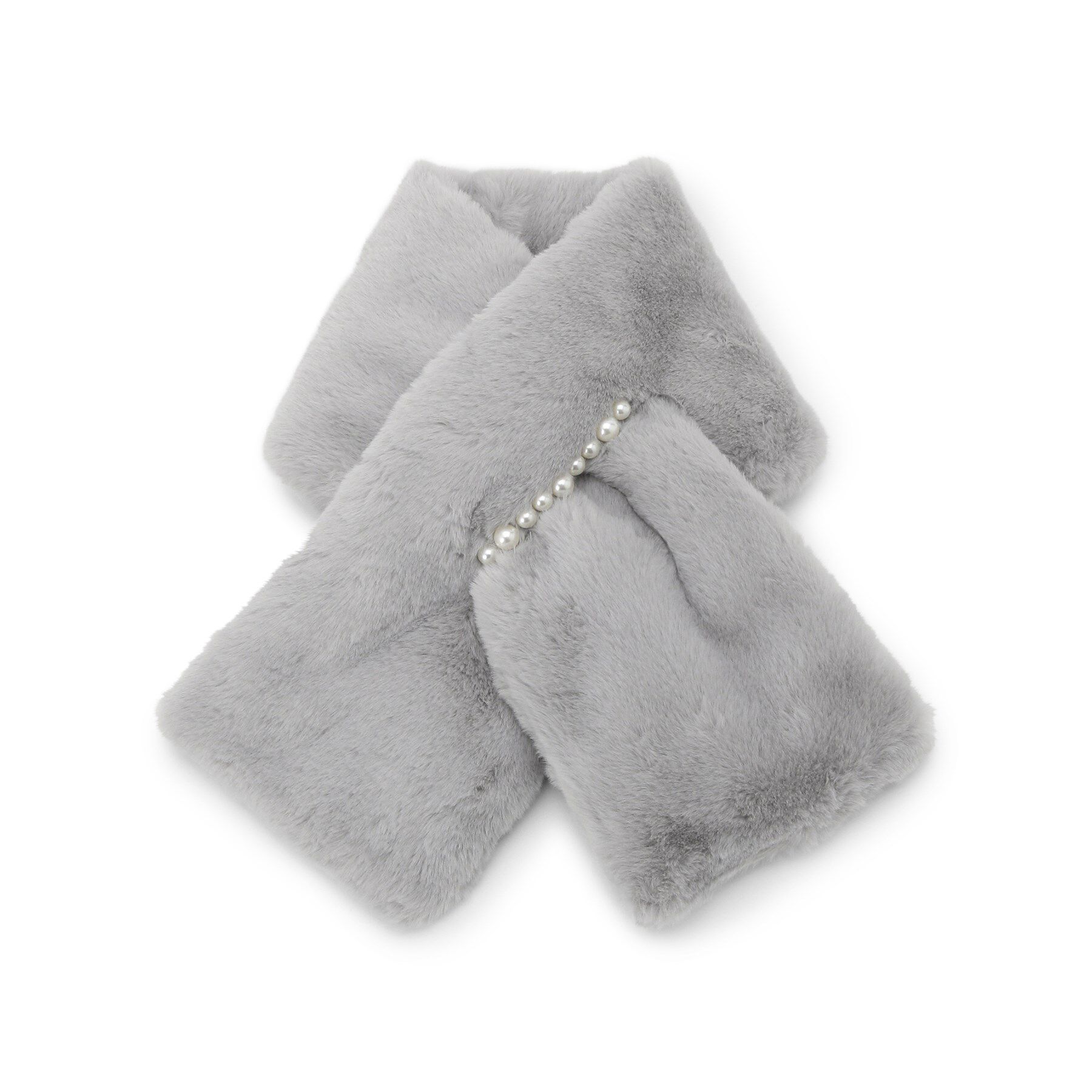 【デザイン】中綿入りで肉厚のフェイクファーティペット。差し込み口に大小異なるフェイクパールを連なったデザインで、アクセサリーがなくても顔回りを華やか.. |