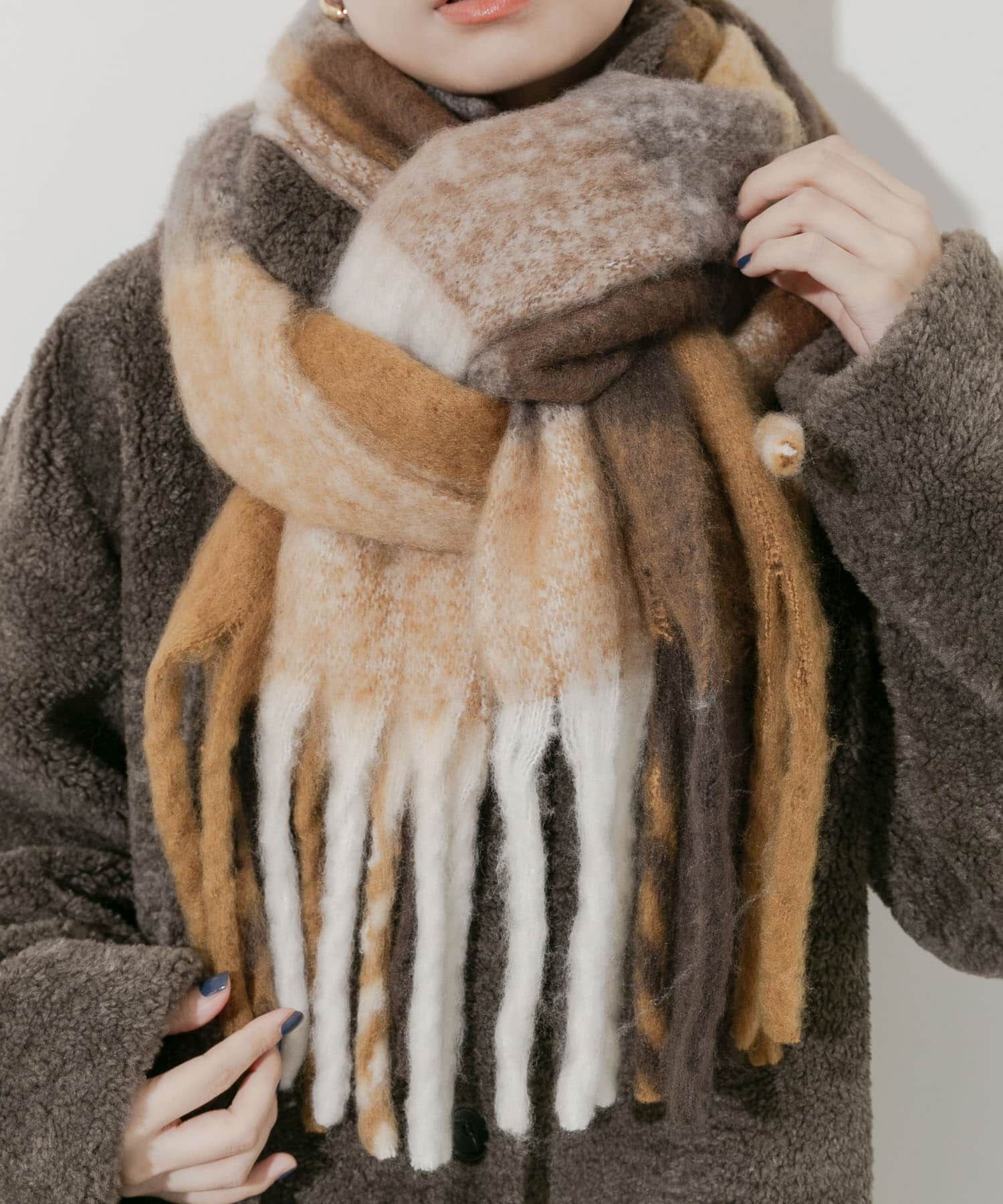 【ふわふわ起毛感が心地よい、大判チェックマフラー】●思わず顔をうずめたくなるようなフワフワ感●スタイリングの主役になる大きめチェック●首元を温かく包み.. |
