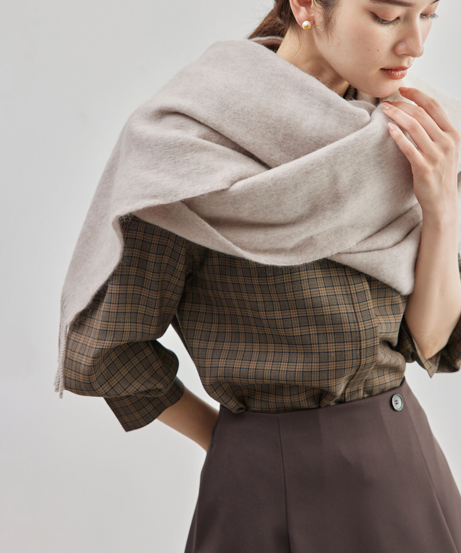 【デザイン・シルエット】リバーシブルで使える、柔らかなラムウール100%の大判ストール。やさしい色味が、冬の装いに温もりを添えます。【スタイリング】ブ.. |
