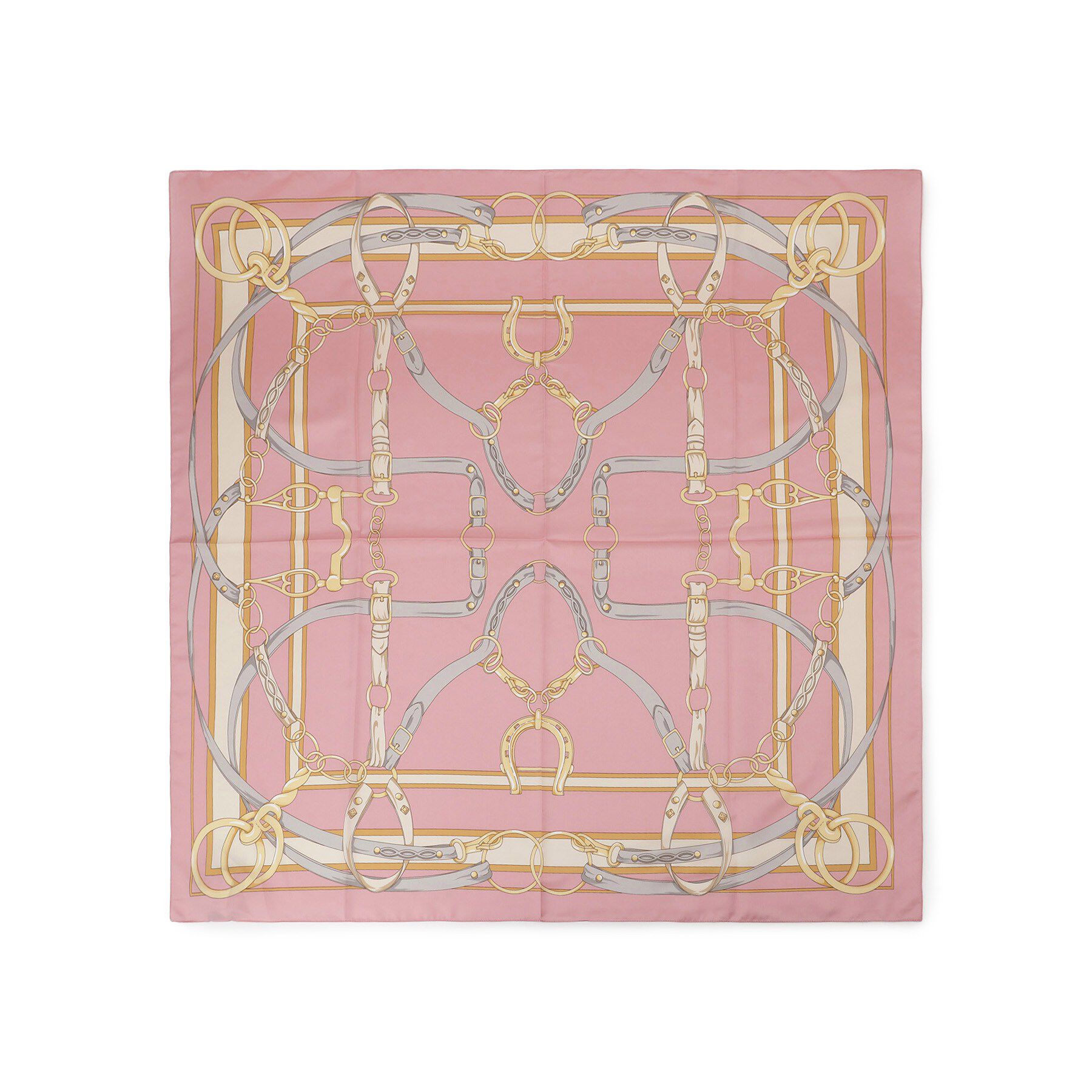 マエストラと馬具を組み合わせ、中央にはロープでブランドロゴを表現したオリジナル柄スカーフ。3カ所に小さく隠しロゴを入れた、遊び心のある一枚です。65�×6.. |