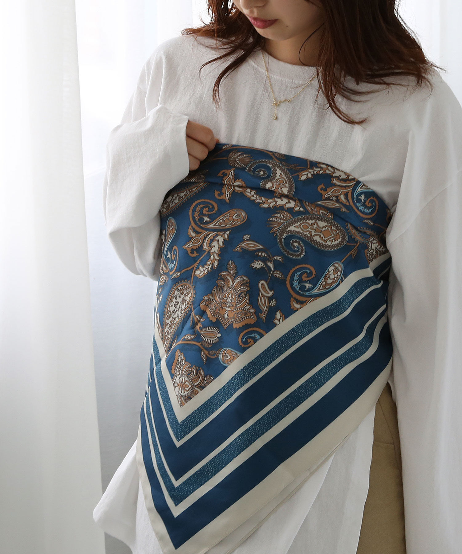 【コーデに取り入れやすいモノトーンカラーのスカーフ】爽やかなペイズリー柄が引き立つモノトーンカラーの正方形スカーフ。ベーシックなカラーなのでお洋服や.. |