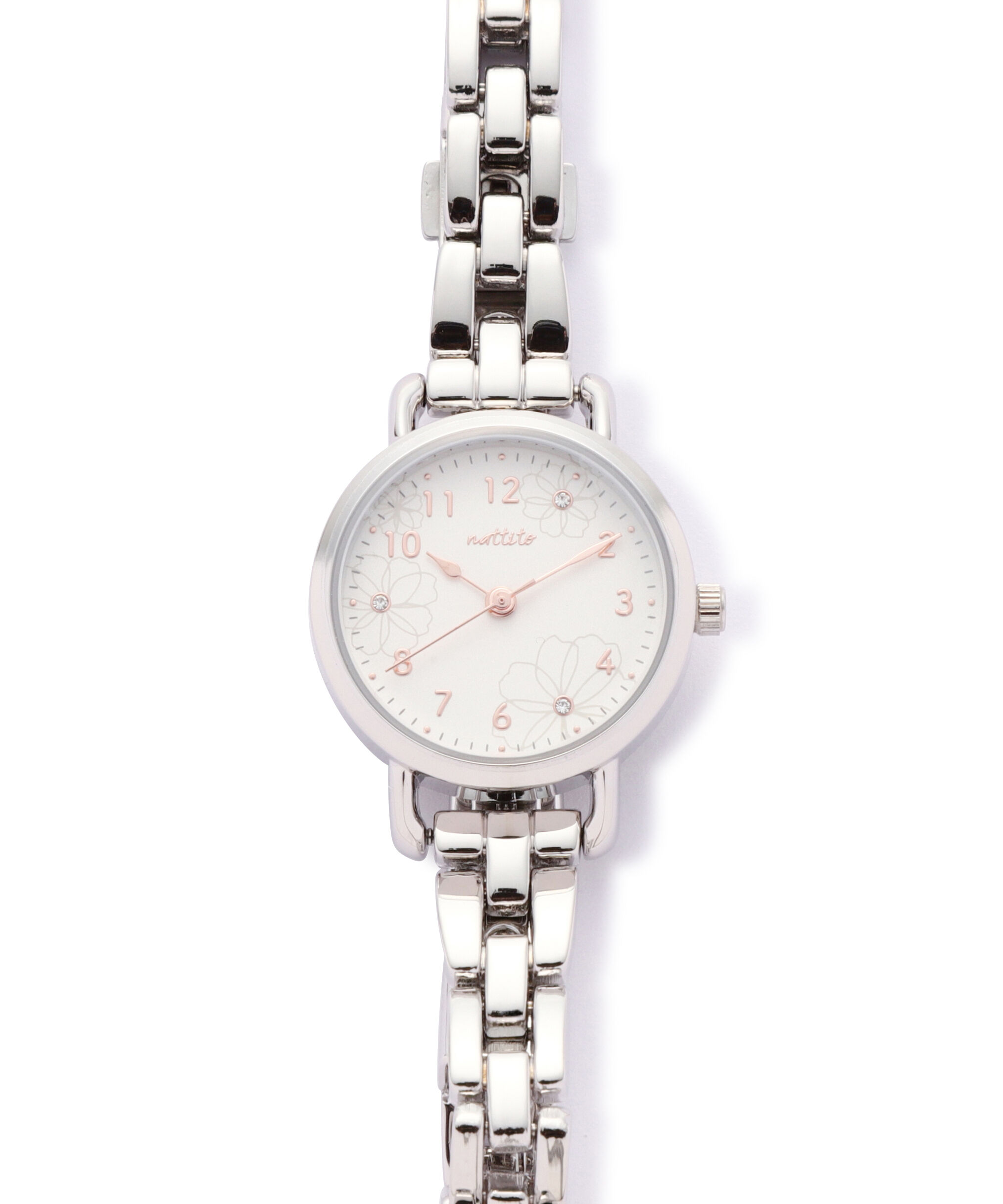 さり気ないフラワーモチーフがフェミニンな雰囲気のメタルウォッチ。身につけるだけで女性らしい手元に見せてくれます。文字盤には秒針つき。オンにもオフシー.. |