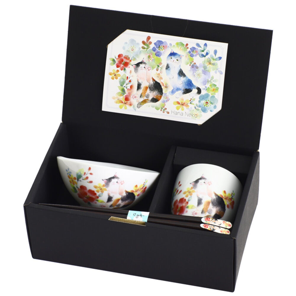 【商品説明】【花と猫の和食器ギフト】猫好きが喜ぶ日本製3点セット「天宝箸付飯碗湯呑セット」。【レンジOKの実用派】飯碗も湯呑も電子レンジ対応だから温め.. |