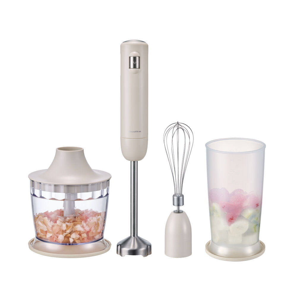 面倒な料理の下ごしらえはもちろん、離乳食作りまで幅広いシーンで活躍するスティック型のブレンダー。 泡立て用の[ホイッパー]や、みじん切りができる[チ..