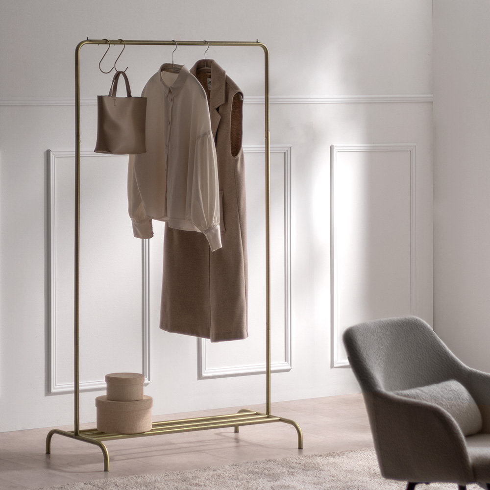 真鍮風ハンガーラック MYRE〔マイア〕 90cm幅/真鍮のような美しい光沢をまとった、アンティークゴールドのハンガーラック。シンプルで上品な佇まいが、空間に.. |
