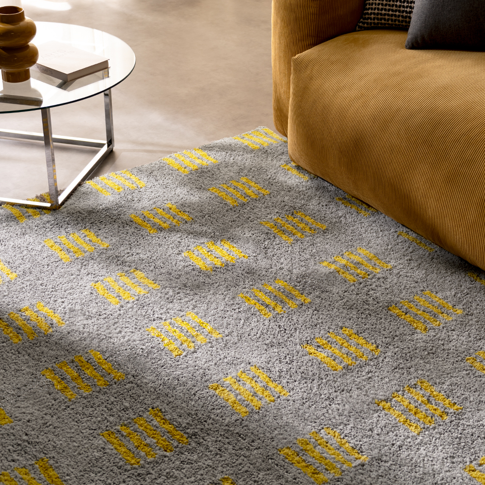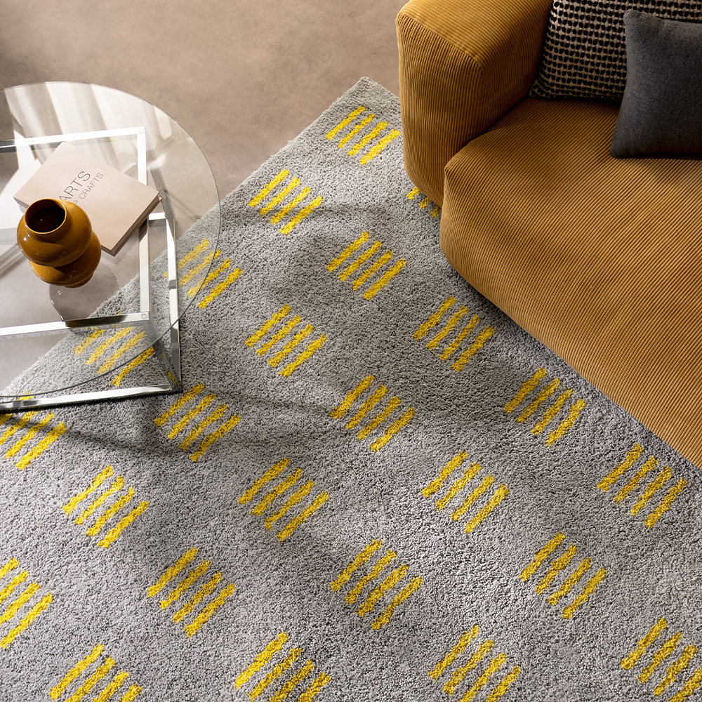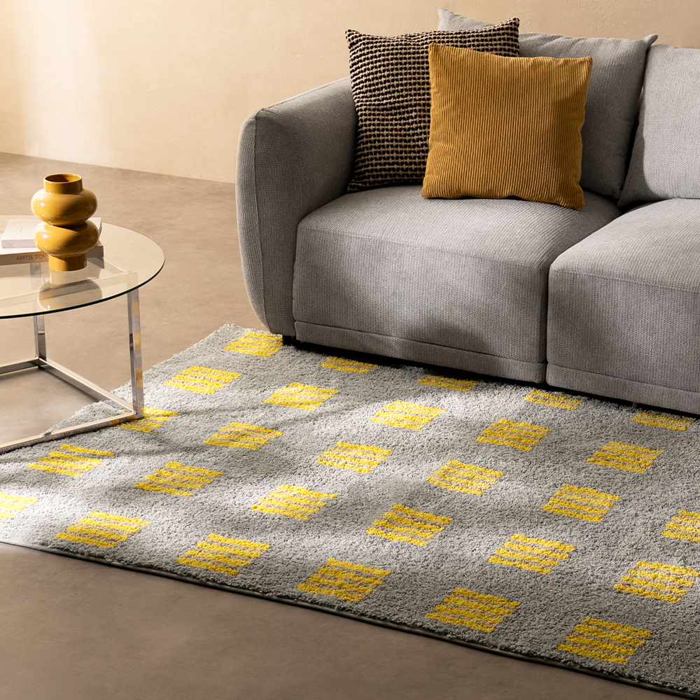 スクエアドットシャギーラグ Ordra〔オルドラ〕 135x200cm/明るいグレーベースに、リズムよく並ぶイエローの差し色。毎日の足もとに、ほどよい遊び心を添える..